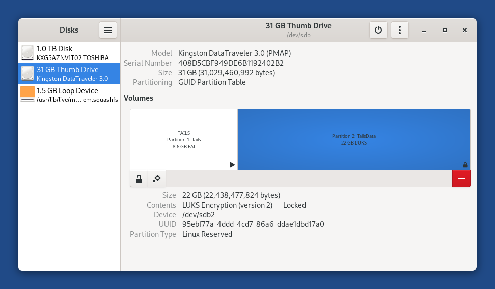 1 volume with a TailsData label and LUKS content.