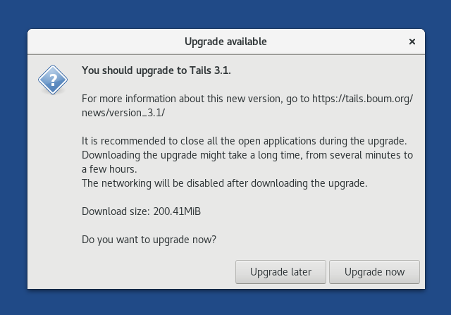 If you cannot upgrade at startup, you can open Tails Upgrader later by choosing Apps ▸ Tails ▸ About Tails and clicking Check for Upgrades.